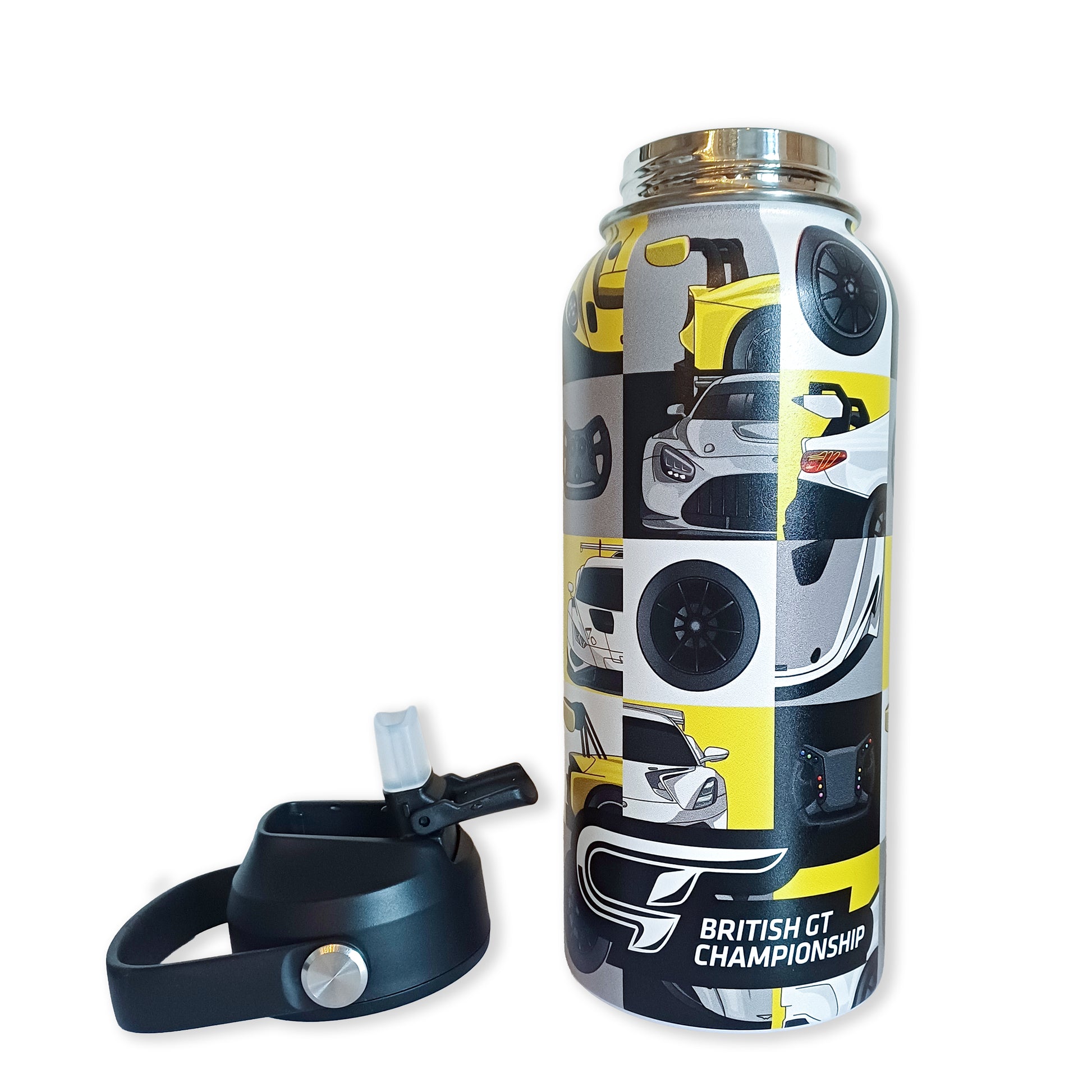 Full wrap around design 1 litre sports bottle with double walled stainless steel screw on lid with flip top drinking spout. The lid features a handle for easy carrying